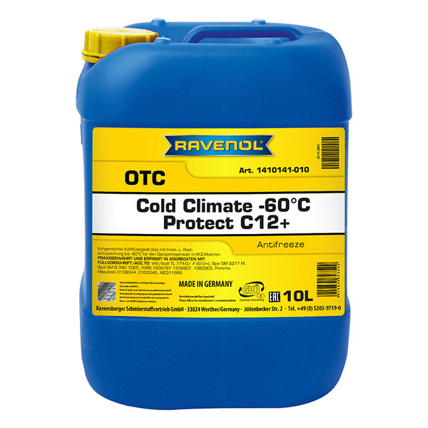RAVENOL OTC COLD CLIMATE -60°C - готовая к применению охлаждающая жидкость, предварительно смешанная с водой, без содержания силикатов, боратов, нитритов, аминов и фосфатов, разработанная на основе 1.2- Ethandiol (моноэтиленгликоля) для систем охлаждения, гарантирующая защиту от коррозии и замерзания, с применением запатентованной технологии ОАТ и добавлением ингибиторов коррозии, что продлевает срок использования и защиту при экстремально низких температурах при применении в климатических зонах с пониженными температурами.