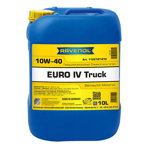 RAVENOL EURO IV Truck SAE 10W-40 - универсальное полусинтетическое моторное масло на основе синтетического базового масла в сочетании с самыми современными добавками для дизельных двигателей с турбонаддувом и без большегрузных автомобилей, автобусов и спецтехники, а также для 4-х тактных дизельных двигателей последнего поколения.
