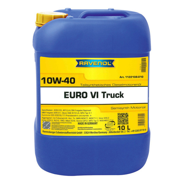RAVENOL EURO VI Truck SAE 10W-40 – универсальное полусинтетическое моторное масло, созданное на основе специально подобранного пакета присадок для грузовых автомобилей с низким содержанием сульфатной золы (Low SAPS), а также для дизельных двигателей. Отлично подходит для использования в двигателях EURO4, EURO 5 и EURO 6 в сочетании с дизельным топливом с низким содержанием серы.