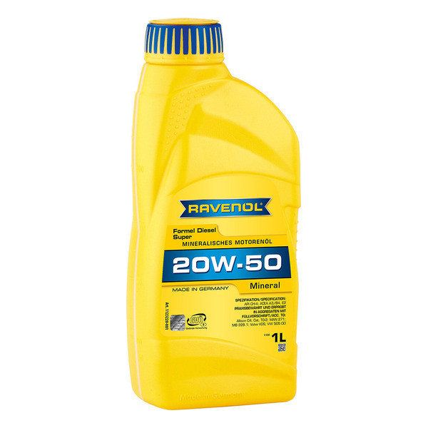 RAVENOL Formel Diesel Super 20W-50 - высококачественное минеральное моторное масло для дизельных двигателей легковых и грузовых автомобилей с турбонаддувом и без. Обеспечивает прочную масляную пленку и устойчивость к сдвигу, прекрасные очищающие свойства и высокую устойчивость к старению.