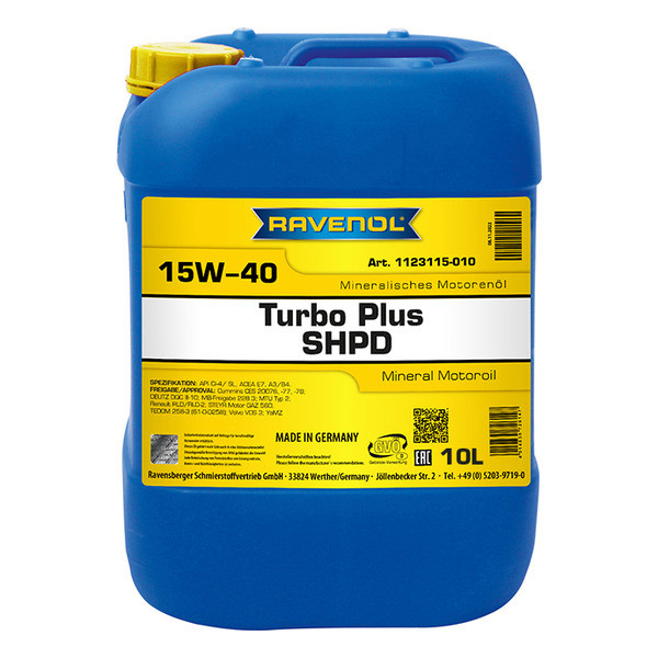 RAVENOL Turbo plus SHPD SAE15W-40 – минеральное моторное масло класса SHPD для смешанного автопарка. Предназначено для использования дизельных и бензиновых двигателей также с турбонаддувом. Гарантирует удлиненный интервал замены (согласно инструкции автопроизводителя).