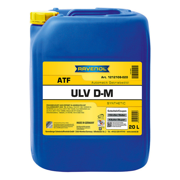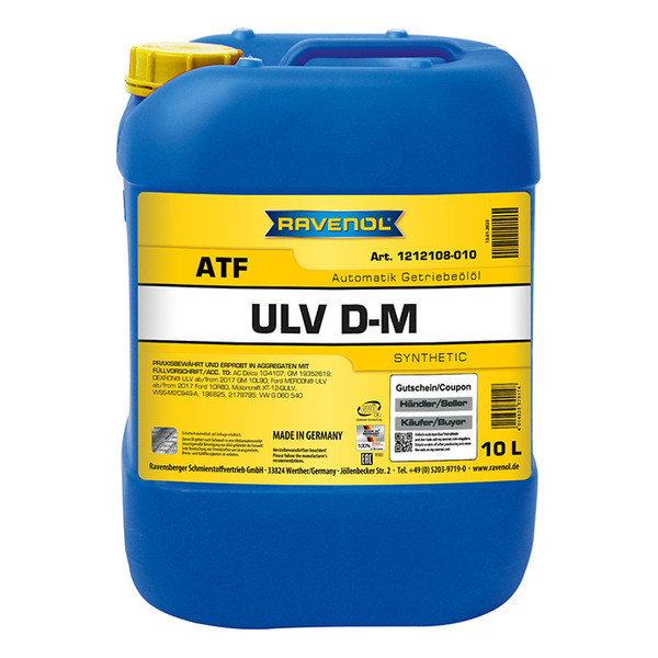 RAVENOL ATF ULV D-M это жидкость для автоматических трансмиссий (ATF), разработанная для новейших 6, 8 и 10-ступенчатых автоматических трансмиссий от Ford и GM.